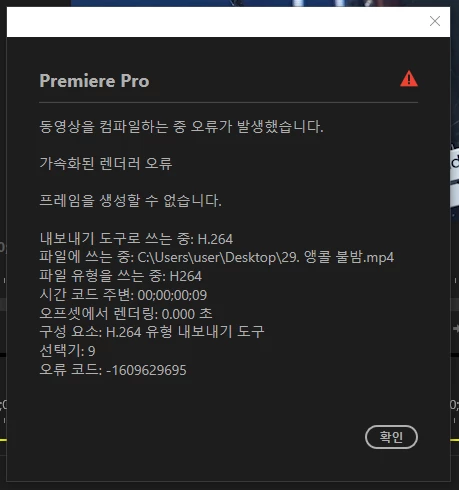우선 미디어 캐시를 삭제하고 새로운 프로젝트 에서 시퀀스 내용물을 복사 붙여넣기 하고 클립에 따른 시퀀스 설정 변경후 렌더링을 진행해 보시거나 오류창에 나타나는 저 구간을 잘라내고 새로운 시퀀스에 작업물을 복사 붙여넣기해서 렌더링을 진행해 볼 수 있습니다.