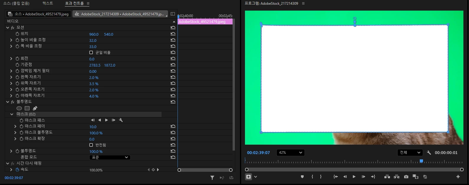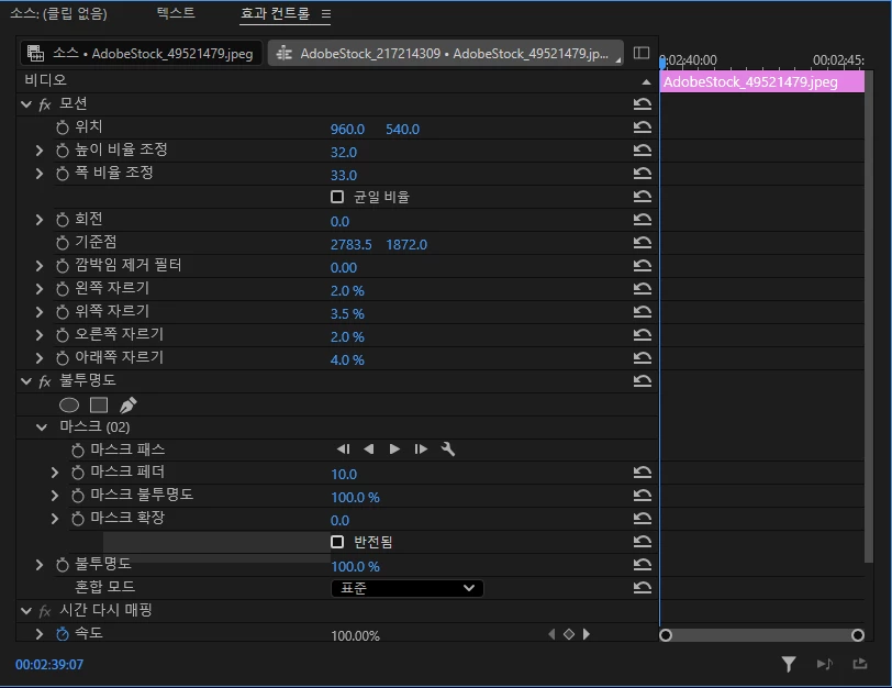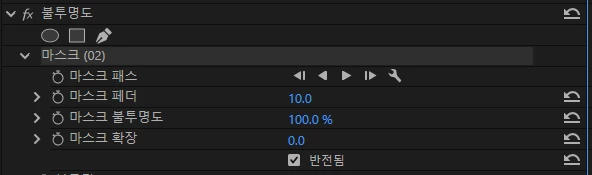 이제 효과 패널을 보면 '불투명도' 옵션 아래에 마스크 패스 옵션 부분이 생성이 되었고