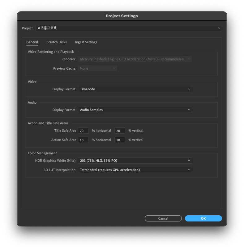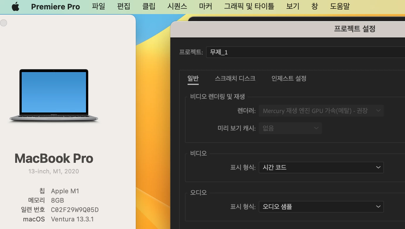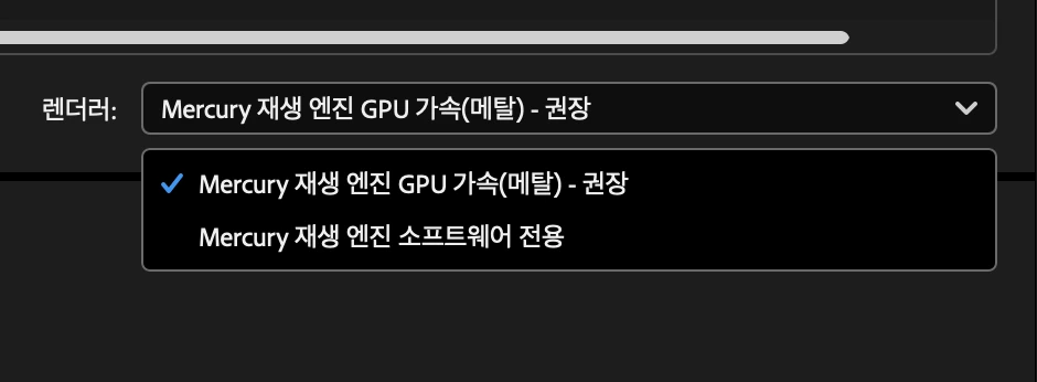 Apple M1~2 기기의 경우 그래픽 장비(GPU)와 프로세서 장비(CPU)가 통합으로 되어 있기 때문에 프리미어 프로에서는 렌더러 옵션을 선택할 수 없습니다.