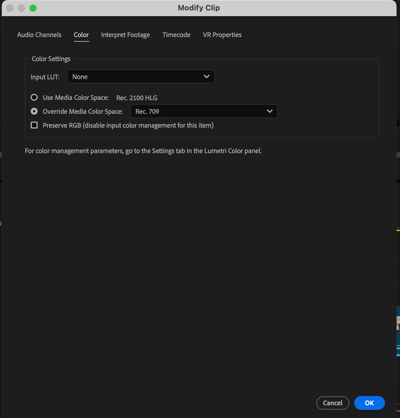 • 색상 공간 재정의(Override) - Rec. 709 로 변경