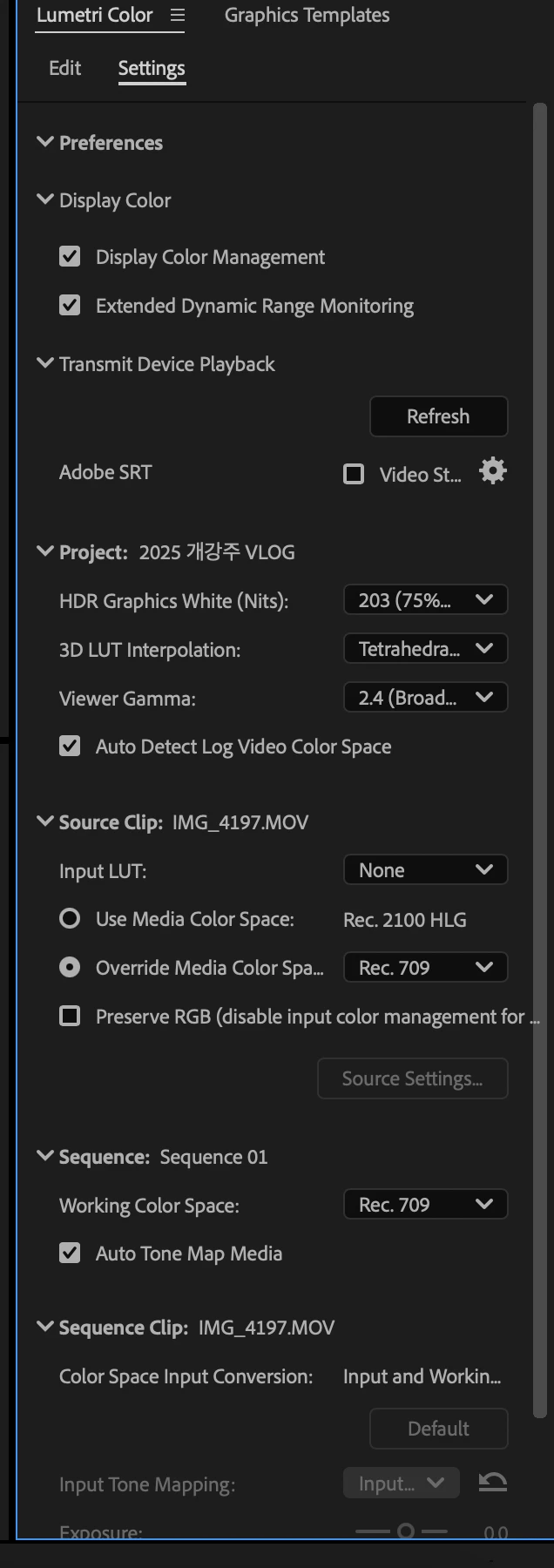 Premiere Pro에서 HDR 영상을 편집하려고 하는데, 자동으로 색 보정이 적용됩니다. 혹시 원본 색감 그대로 다시 보여주실 수 있을까요?