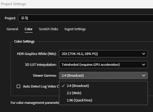 프리미어프로는 HDTV 표준 감마 값인 2.4를 기본으로 채택하고 있습니다.
