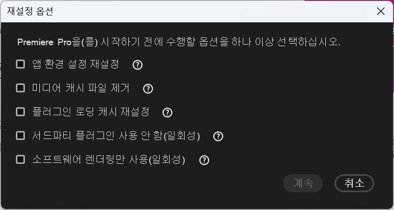 만약 소프트웨어 렌더링이 필요한 경우에는 프리미어 프로를 열기 할때 Shift를 누른채로 부팅을 하면 재설정 옵션이 열리는데 이쪽에서 소프트웨어 렌더링만 사용을 할 수 있습니다.