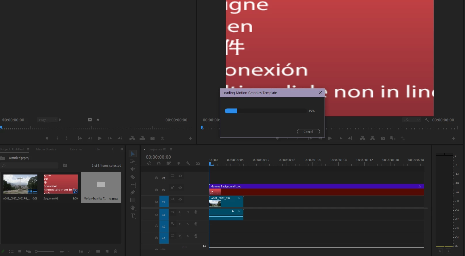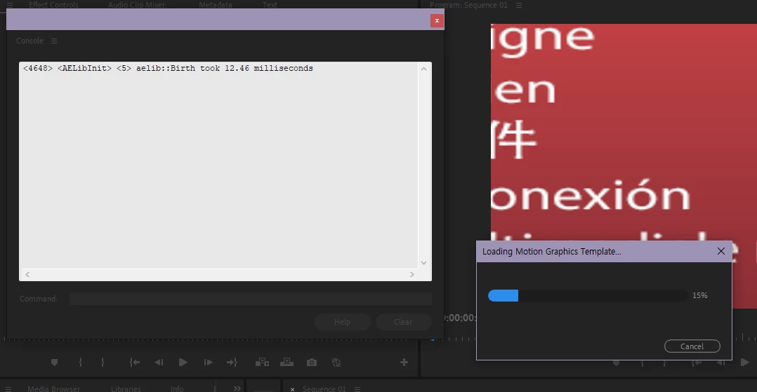 mogrt 파일을 타임라인 위에 드래그앤드롭 하면 "모션 그래픽 템플릿 로드중" 팝업이 15%에서 멈추고 더 이상 진행되지 않습니다.
