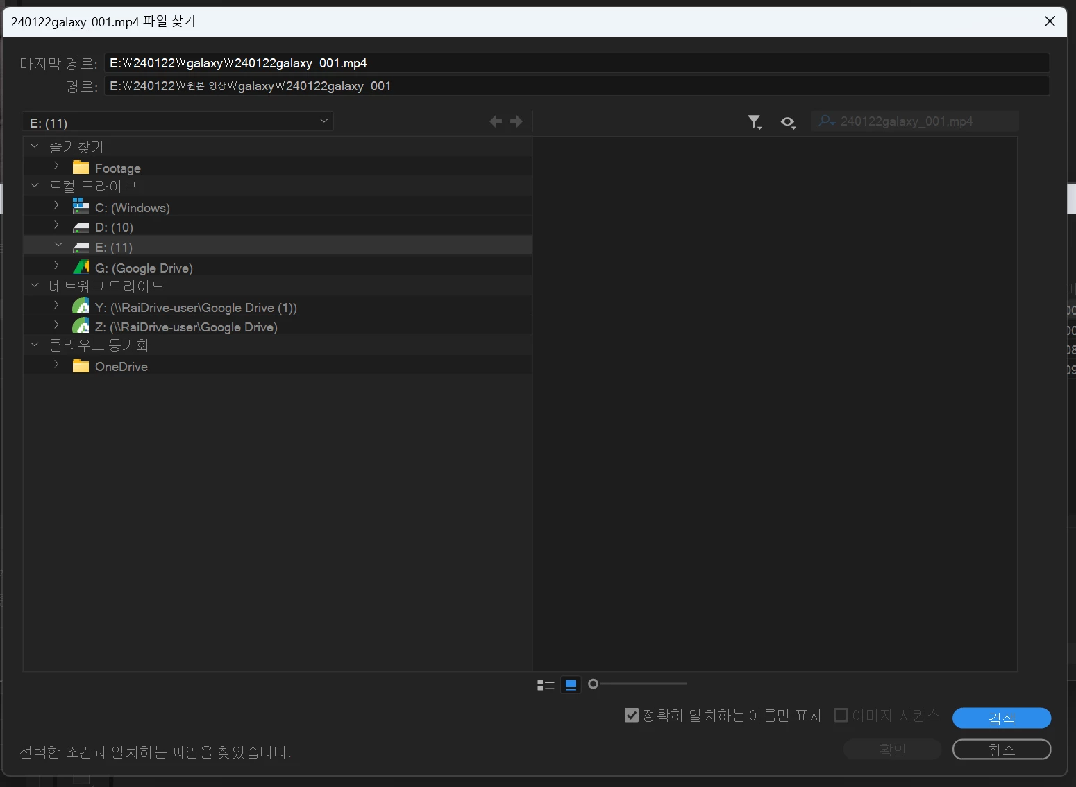2. 검색 버튼을 눌렀더니 캡쳐 화면 좌하단에 나오는 것처럼 '선택한 조건과 일치하는 파일을 찾았습니다.' 문구가 뜹니다.