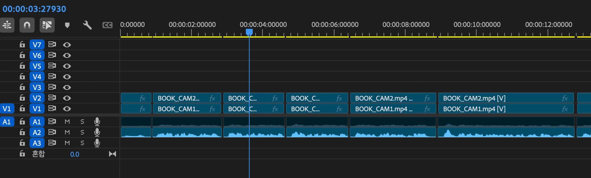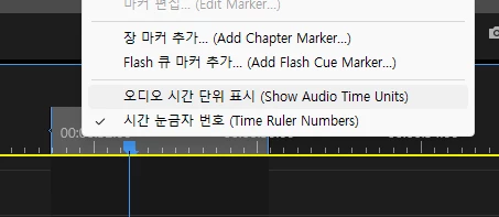 첨부해주신 이미지를 보면 현재 타임라인의 TC부분이 오디오 시간단위로 설정되어 있는것을 볼 수 있습니다.