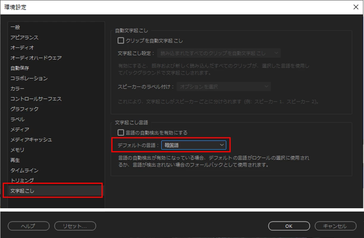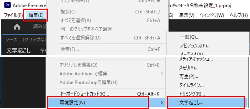 ①메뉴의 「편집」→「환경 설정」→「문자 일으키기」를 선택합니다.