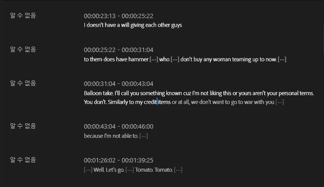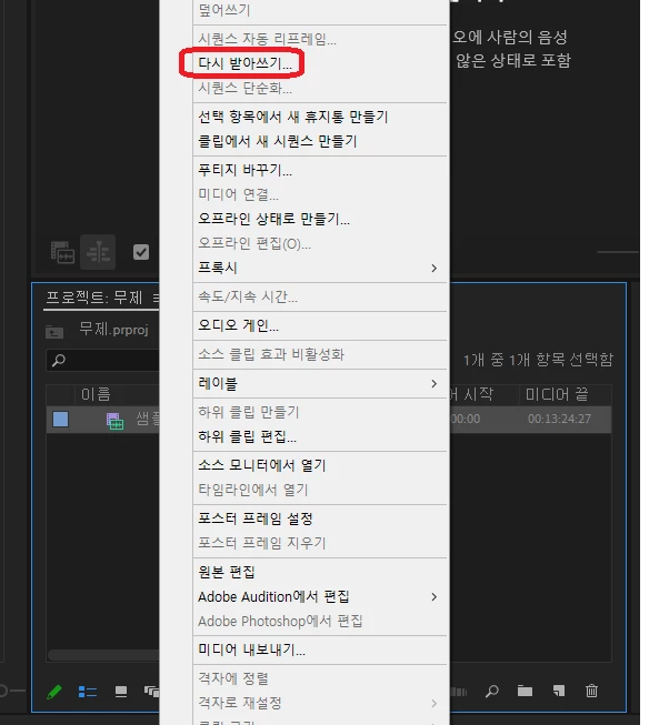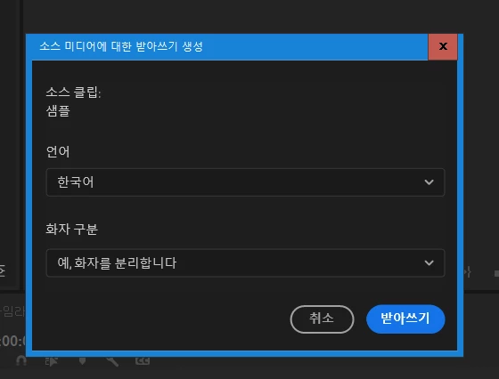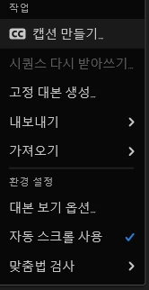 영상파일 우클릭 > 받아쓰기 선택 (또는 다시 받아쓰기)> 한국어 설정 > 받아쓰기 클릭해주세요