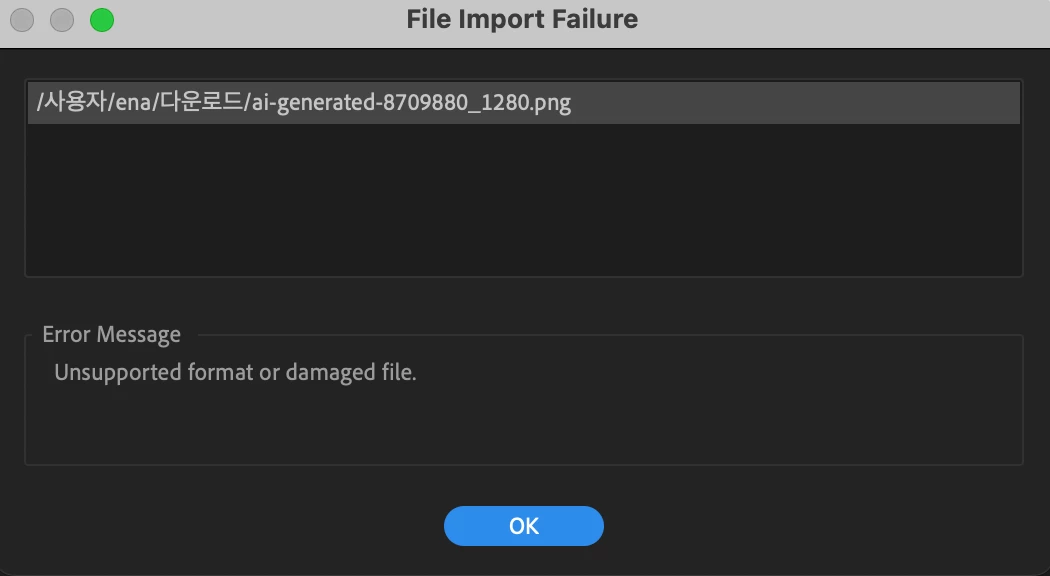 이미지 뷰어로 파일을 열었을 때 정상적으로 열린다면, 해당 이미지를 복사해서 바탕화면 등 기본디스크 위치로 붙여넣고 Premiere Pro로 가져와보세요.