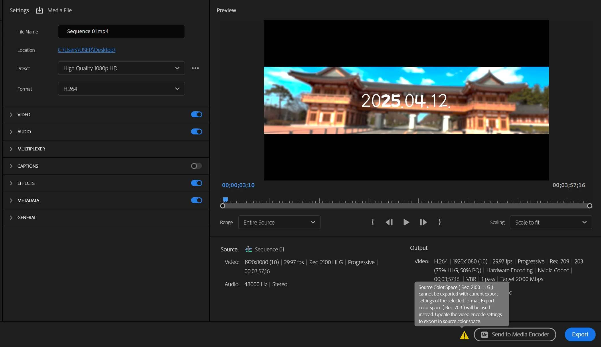 시퀀스의 색공간을 변경하여 영상 편집을 진행하고 출력을 하면 색감이 과노출이 된 것 처럼 색감이 이상해집니다. 혹시 해결 방법이 있을까요??