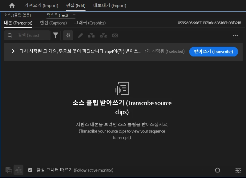 만약 해당 시퀀스 다시 받아쓰기가 비활성화 되어 있다면 해당 영상과 오디오를 링크 해제를 진행후 오디오를 더블클릭후에 클립 다시 받아쓰기 버튼이 활성화 되는것을 확인 할 수 있고, 다시 설정후 받아쓰기를 다시 진행할 수 있습니다.