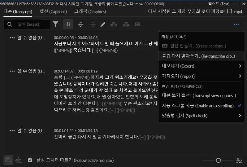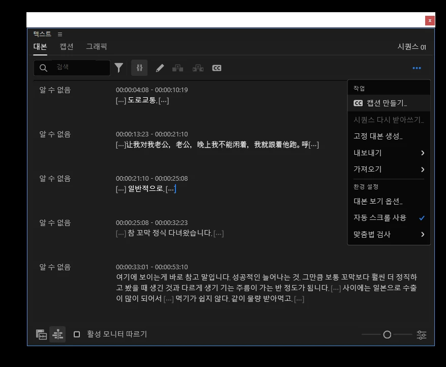 일단 자동으로 받아쓰기 옵션을 끄셨다면 해당 옵션 상태에서 새프로젝트를 만들어서 영상을 다시 불러온다음 원하는 설정을 진행후 받아쓰기를 진행하는 방법이 있고
