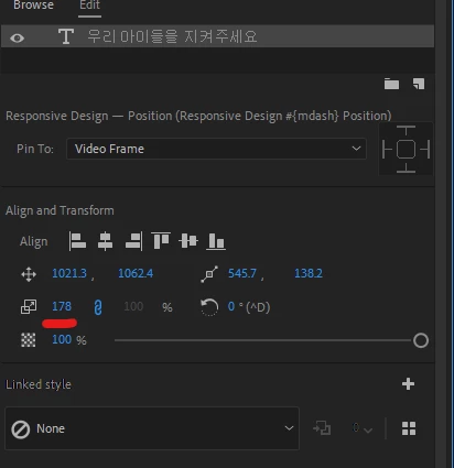 에센셜 그래픽 내부 자막을 눌러서 하나하나 조절해야 합니다