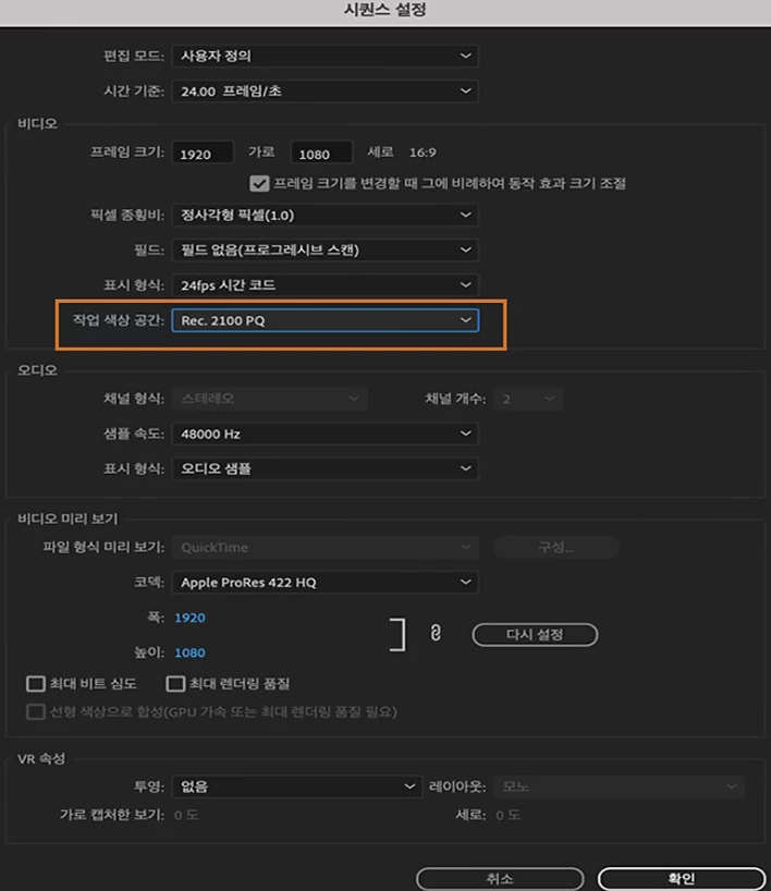 Premiere Pro는 자동으로 새 작업 영역을 Rec. 2100 HLG로 설정합니다.