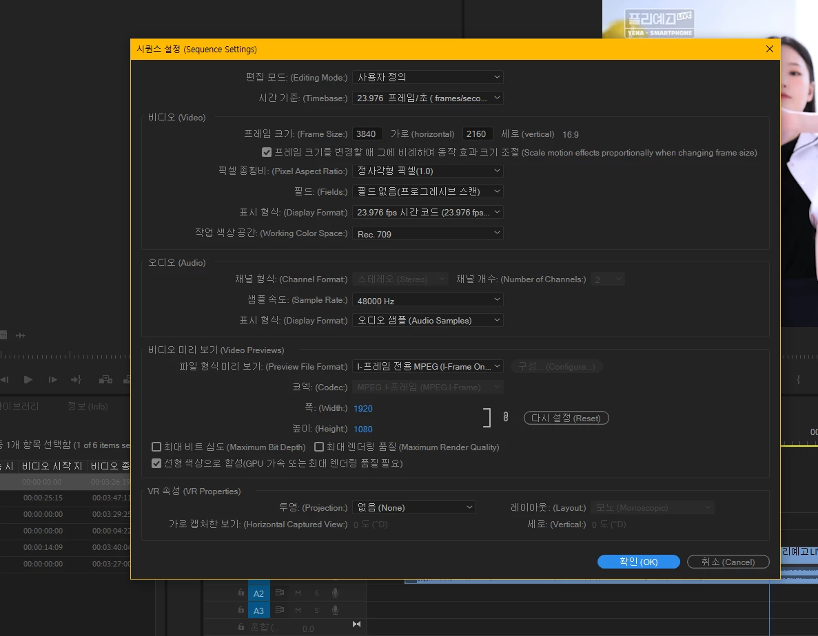 샘플 레이트는 윈도우와 프리미어 프로 둘 다 48000hz로 설정해두었습니다.