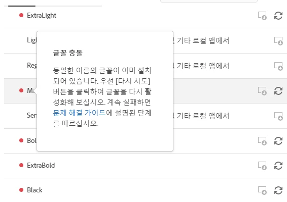 어도비 폰트를 다운받아 사용하였으나 폰트가 보이지 않고 미디어인코더에서 경고가 뜨는 경우