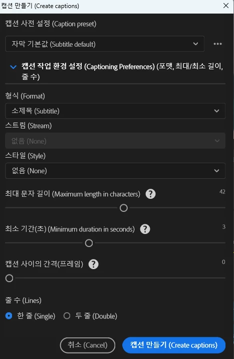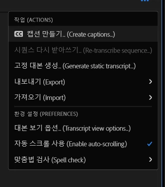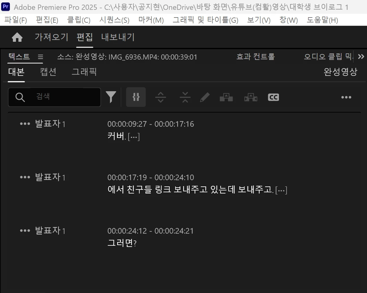 보통 그다음에 자막 수정을 대본에서 완료후 이제 캡션 만들기를 통해서 자막을 직접적으로 뽑아냅니다.