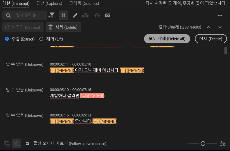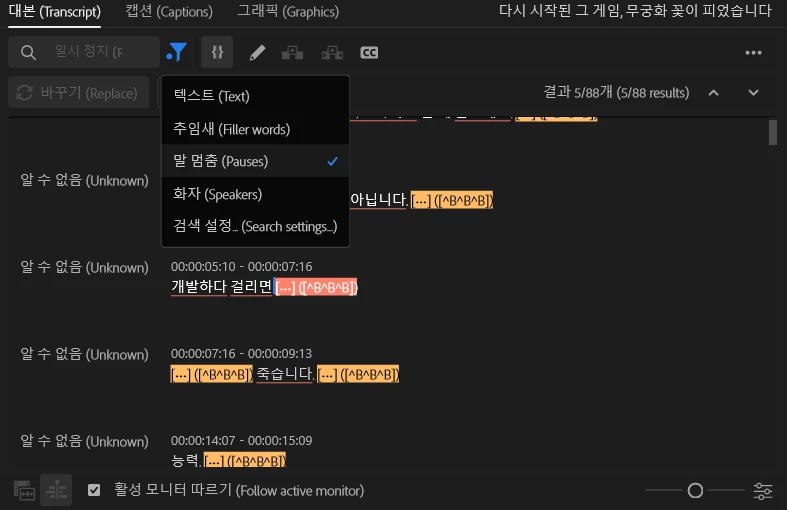 여기서 이제 보통 저는 받아쓰기 옵션에서 말멈춤 부분을 선택해서 추출및 모두 삭제를 진행해서 해당 영상들의 컷편집까지 빠르게 진행을 합니다.