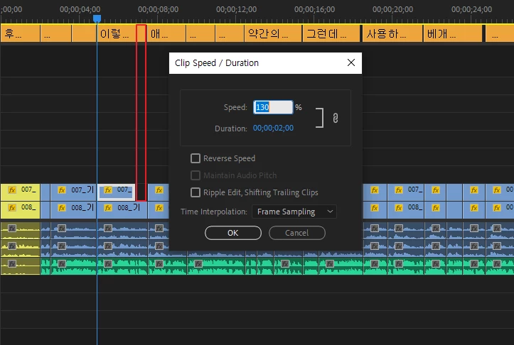 질문1) 타임라인에서 영상 클립의 속도(clip speed/duration)를 130%로 조절하면