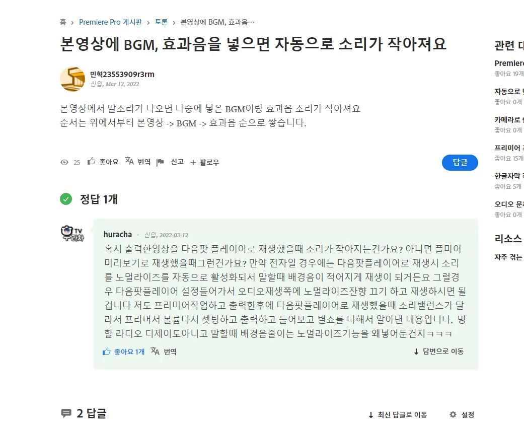 프리미어 오디오 첫번째 트랙에 녹화한 영상의 사운드를 올려놓고 두 번째 트랙에 효과음을 넣었는데요. 추출만 하면 두번째 트랙 효과음이 나오는 부분의 첫 번째 트랙의 사운드가 작아지는 현상이 발생합니다. 해결방법이 있을까요?