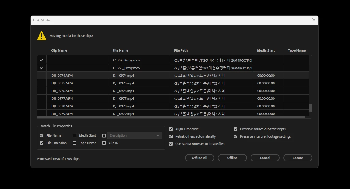 자동으로 연결은 푸티지 데이터가 동일 폴더에 위치한 경우에 작동합니다.