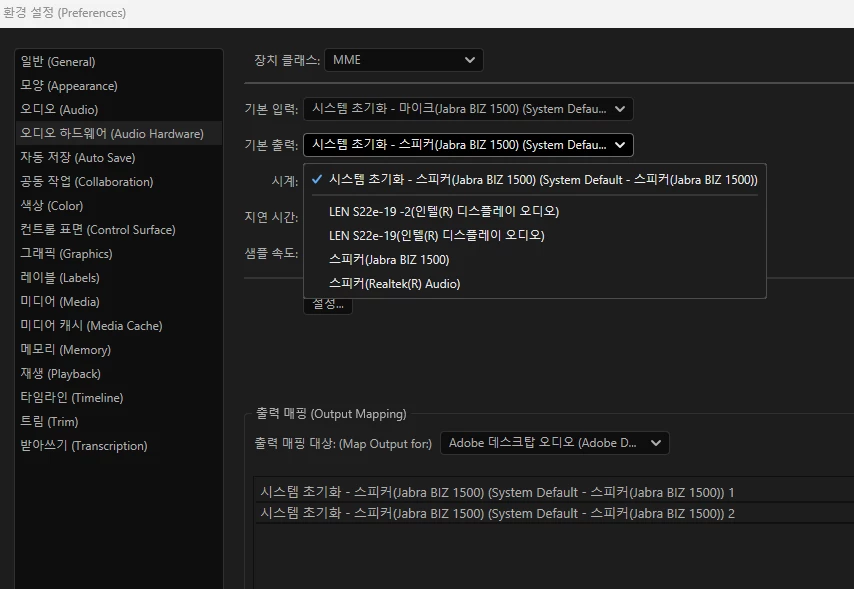 3. 환경설정 오디오 하드웨어에 장치클래스 ASIO, MME 둘다 있음+컴퓨터에 내장 스피커 없이 사용하는 스피커는 기종 하나.