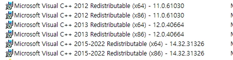 제어판 > 프로그램 추가 제거 > Visual C++  로 된 항목 중 PC 아이콘이 있는 항목을 우클릭 > 변경 > 복구(REPAIR)를 진행하세요.