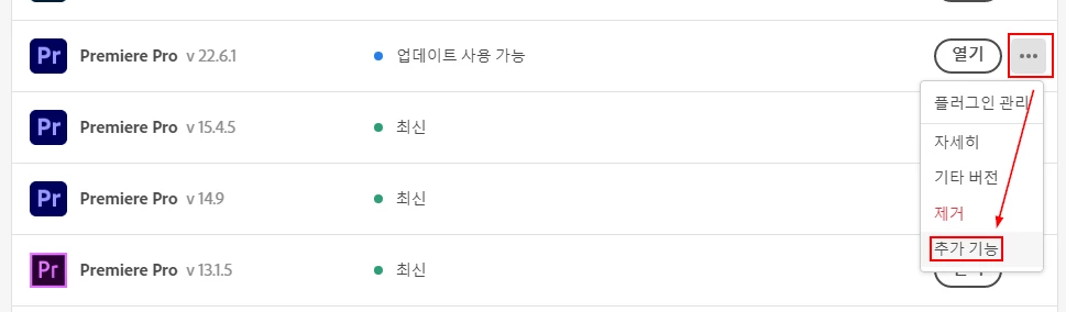 2. 사용 중이신 Premiere Pro를 찾아, 열기 버튼 오른쪽의 점 세개 버튼(기타 액션)을 누르고 추가 기능을 누릅니다.