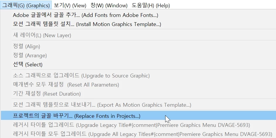 1. 프리미어 프로 상단 메뉴 [그래픽 및 타이틀(또는 그래픽)] - [프로젝트의 글꼴 바꾸기(Replace Fonts in Projects)]를 선택해 주세요.