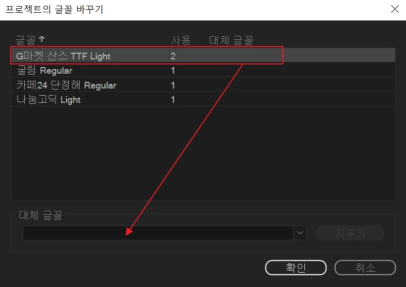 그리고 바꾸고자 하는 글꼴을 선택하고 [대체 글꼴]을 누르면 원하는 폰트를 한 번에 변경할 수 있습니다.