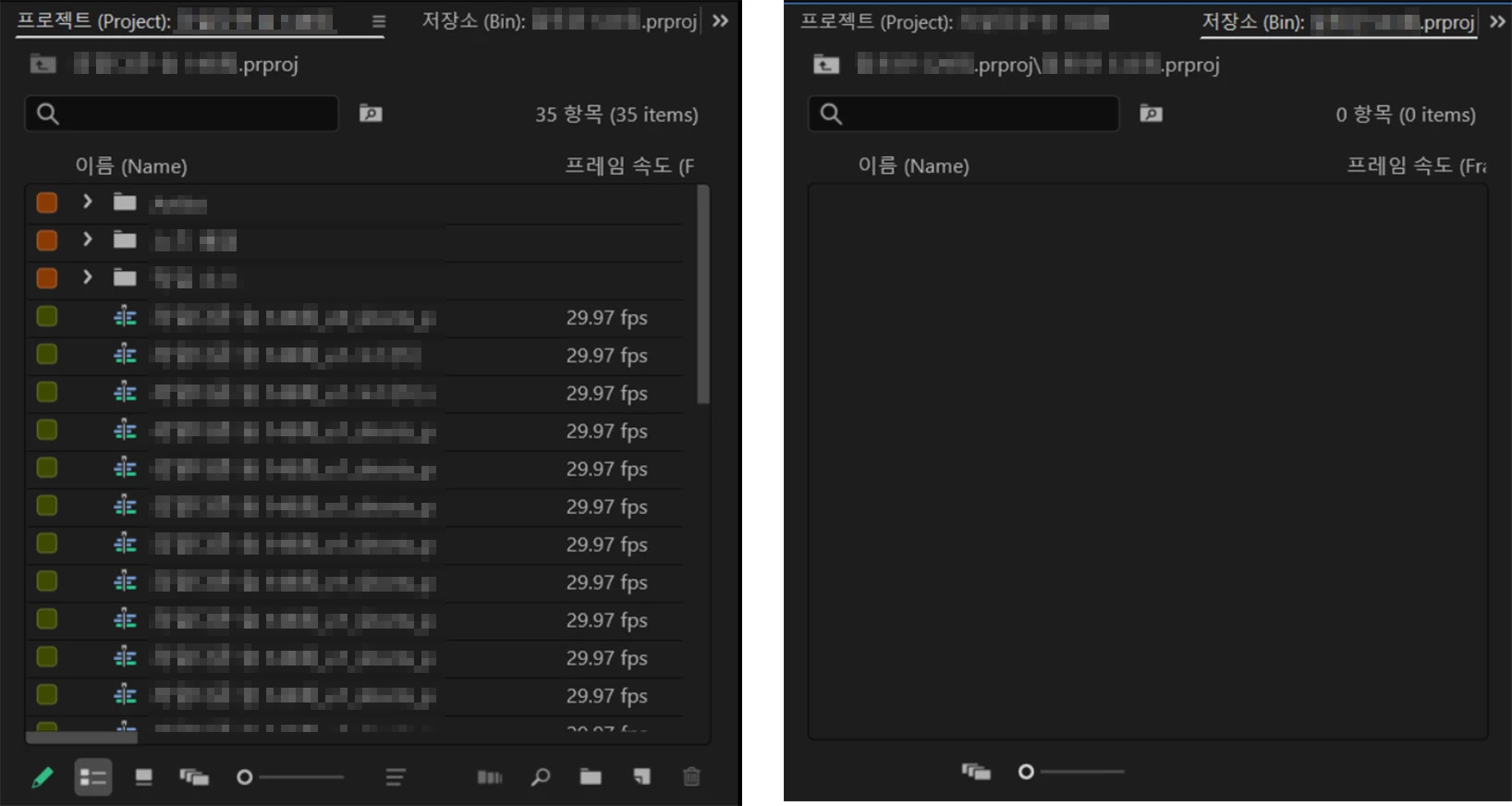프리미어프로에서 작업 중에 다른 프로젝트 열기를(ctrl+o) 하면, 열리지 않는 경우가 종종 발생합니다.