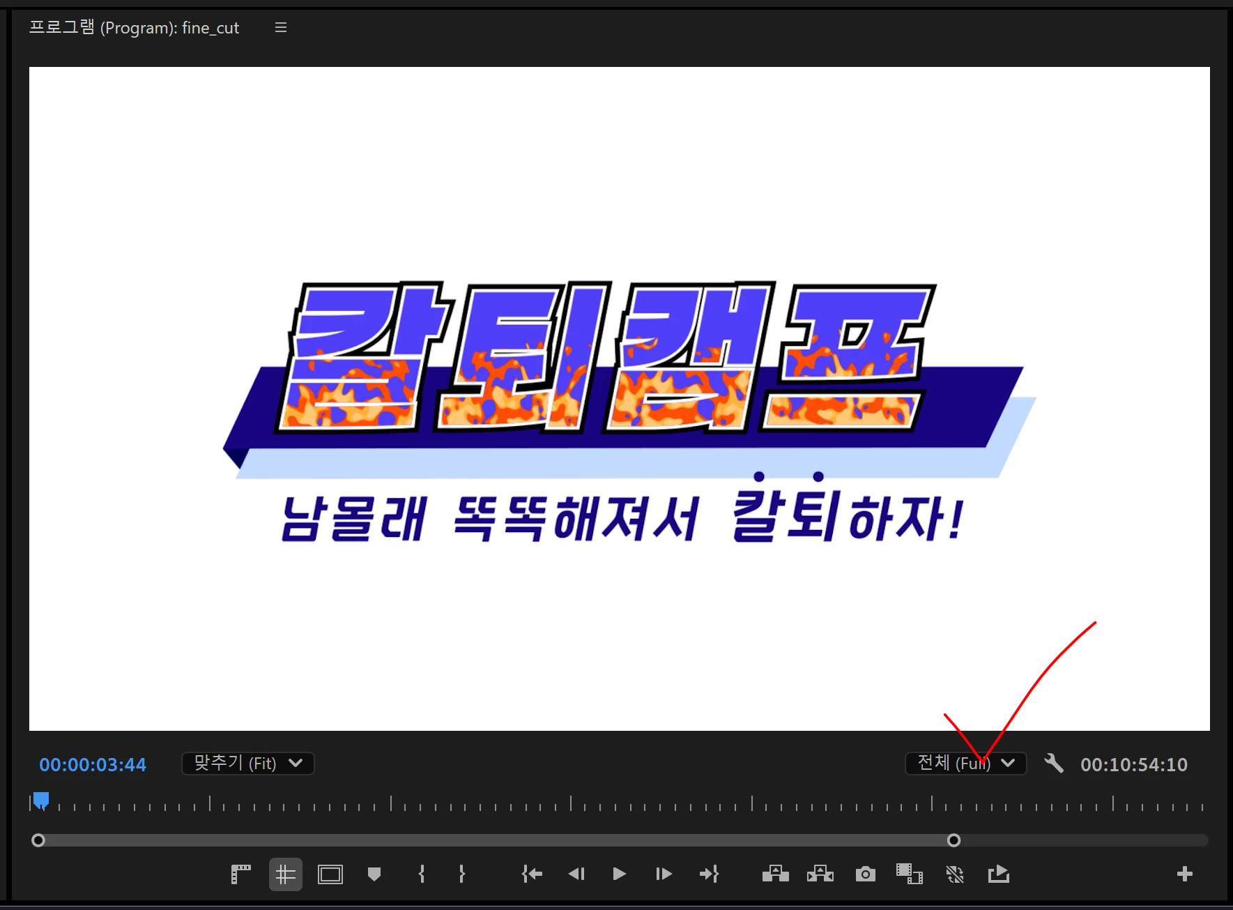 아래 사진에보시면 프로그램 패널(작업화면) 오른쪽 아래에 재생 해상도 선택에서 전체(Full)로 두시면 해상도 높게 잘 나오실거에요 🙂