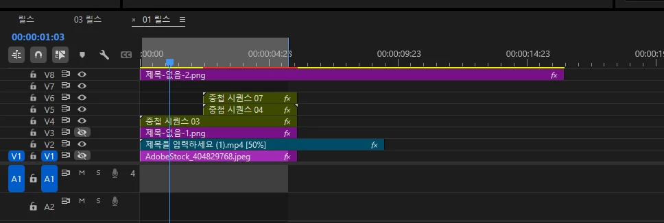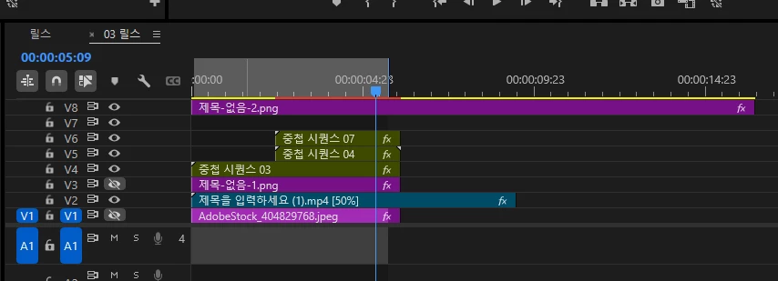 프로젝트 패널에서 중첩 시퀀스를 복사한뒤 타임라인으로 드래그 드롭하여 사용해보세요.