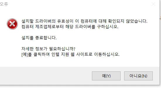 해결방법을 찾다가 [igfx_win10_100.8476] <- 다운받아보라는 글을 보고 다운 받았으나 설치가 안되고 "설치할 드라이버의 유효성이 이 컴퓨터에 대해 확인되지 않았습니다. 컴퓨터 제조사로부터 해당 드라이버를 구하십시오" 라고 뜹니다...