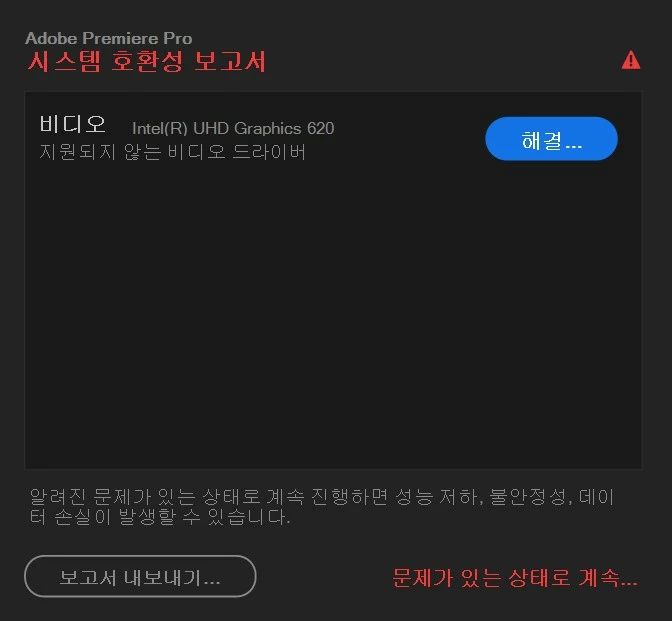 프리미어프로에 들어가면 "지원되지 않는 비디오 드라이버" 창이 뜹니다.