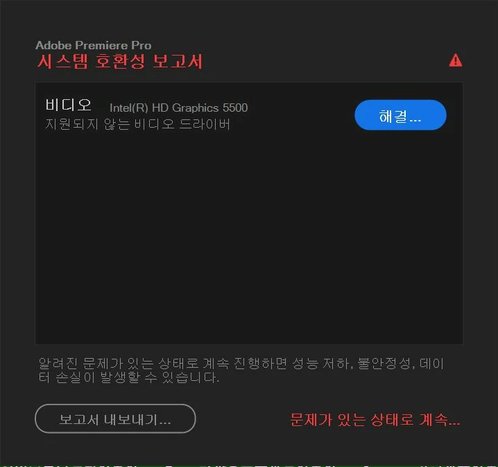 민민일368585277mtoParticipantForum|Forum|2 years agoApril 19, 2024Question'지원되지 않는 비디오 드라이버' 오류Forum|Forum|2 years agoApril 19, 20241 reply1322 views설치를 하고 실행을 하는데 데스크 탑은 잘 작동을 하는데 노트북은 지원되지 않는 비디오 드라이버입니다. 라는 오류가 뜹니다. 문제가 있는 상태로 계속을 눌러 진행을 해보니 영상을 넣고 편집을 하려고 하는데 재생도 안 되고 멈추는 현상이 계속 발생하네요. 드라이브도 업데이트를 하라고 해서 봤는데 최신 상태이고 다른 드라이브 설치는 안 되고 어떻게 해야 할까요? 참고로 제 노트북에 있는 건 Intel(R) HD Graphics 5500 드라이브입니다. 이미지도 첨부합니다. 충돌