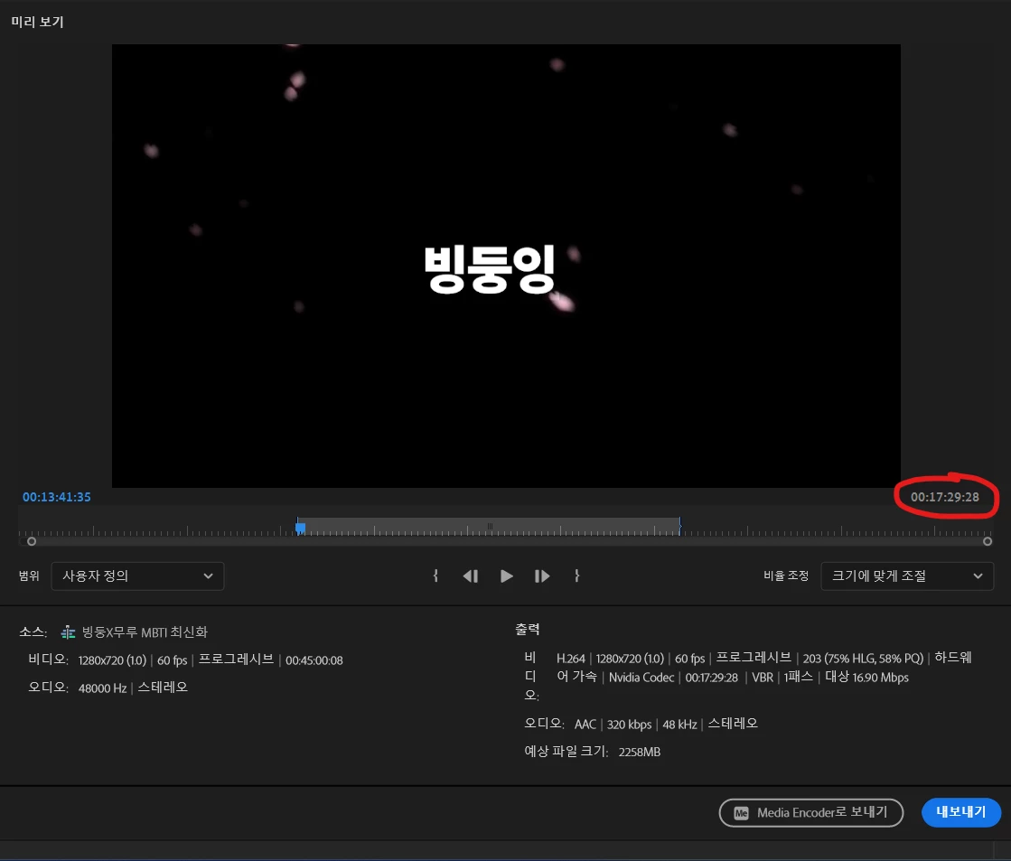 영상 내보내기의 시작 및 종료지점은 { } 회색 바 지점 사이만큼 내보내기가 진행됩니다.