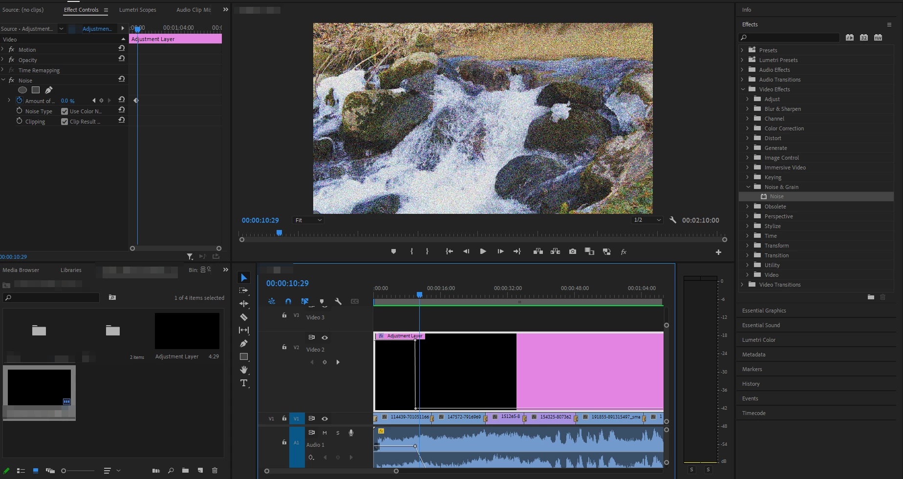 adjustment layer 이외에 다른 영상에는 noise 이펙트가 들어가 있지 않으며, adjustment layer 에는 noise효과만 적용되어 있습니다. (제가 여러 차례 확인했습니다.)