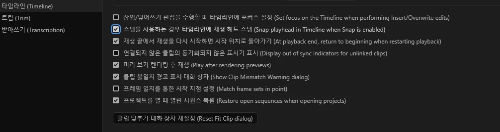 타임라인 스냅, SNAP, 자석 기능 활성화해도 안됩니다