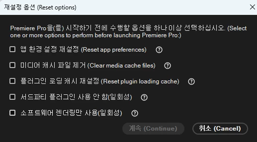 그래픽 카드 드라이버 업데이트 이후 Shift를 누른채로 프리미어 프로를 부팅해서 재설정 옵션을 켜주고 소프트웨어 렌더링으로 일회성 변경후에도 문제가 동일하게 발생하는지 꼼꼼히 확인을 해봅니다.