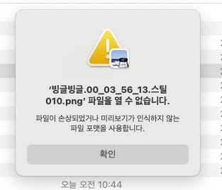 시간이 좀 지난 후에는 파일이 손상되었거나 미리보기가 인식하지 않는 파일 포맷을 사용한다고 나오면서 열리지 않게 됩니다. 깨지는 중간에 열어보면 아래에서 부터 이미지가 사라져 가는게 보입니다.