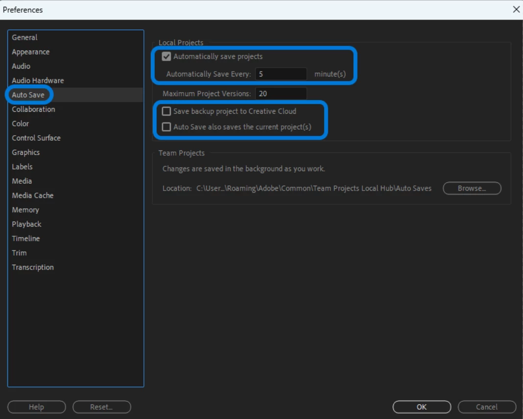 Premiere 내 환경설정 - 자동저장 탭에서 자동저장 간격 조정 및 백업 프로젝트 저장 옵션을 사용할 수 있습니다.