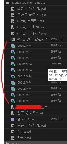 프로젝트 파일 내 motion graphic template 폴더에 원본 영상 및 기타 소스들 지속적으로 생성