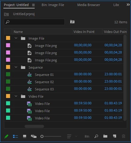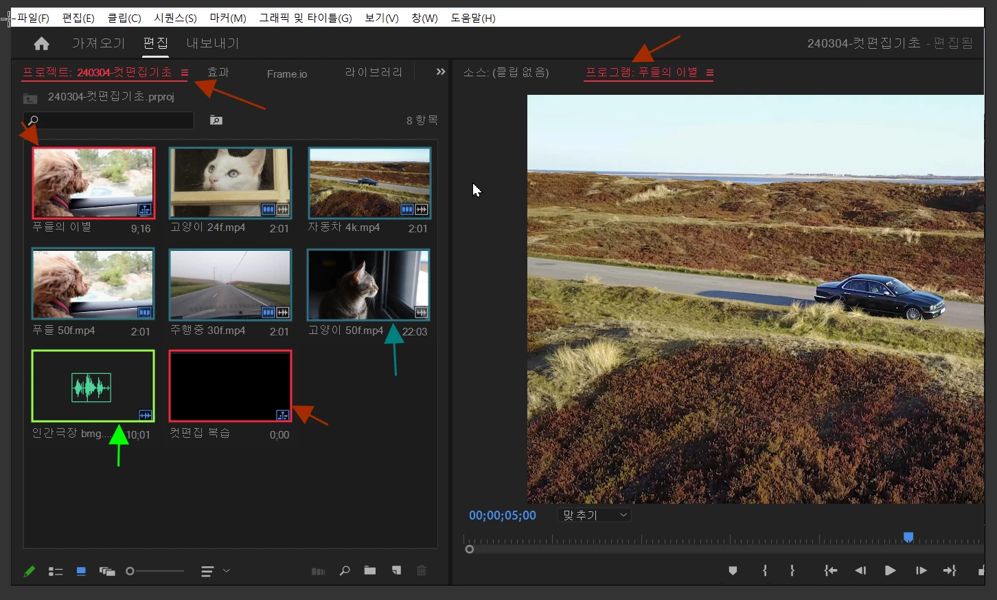 1. 프로젝트 패널의 시퀀스 썸네일과 동영상 썸네일 구분이 쉽지 않음. 시퀀스 썸네일 사각형 테두리에 색으로 표시해서 구분하기 쉽게 수정해야 합니다.