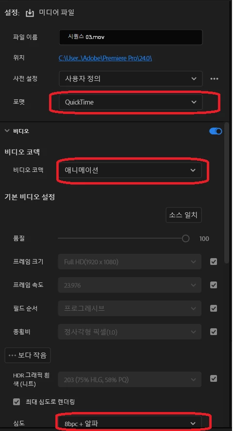 프리미어프로에서 알파채널(투명한부분)을 포함하여 출력을 하고 싶은데 방법을 모르겠습니다.