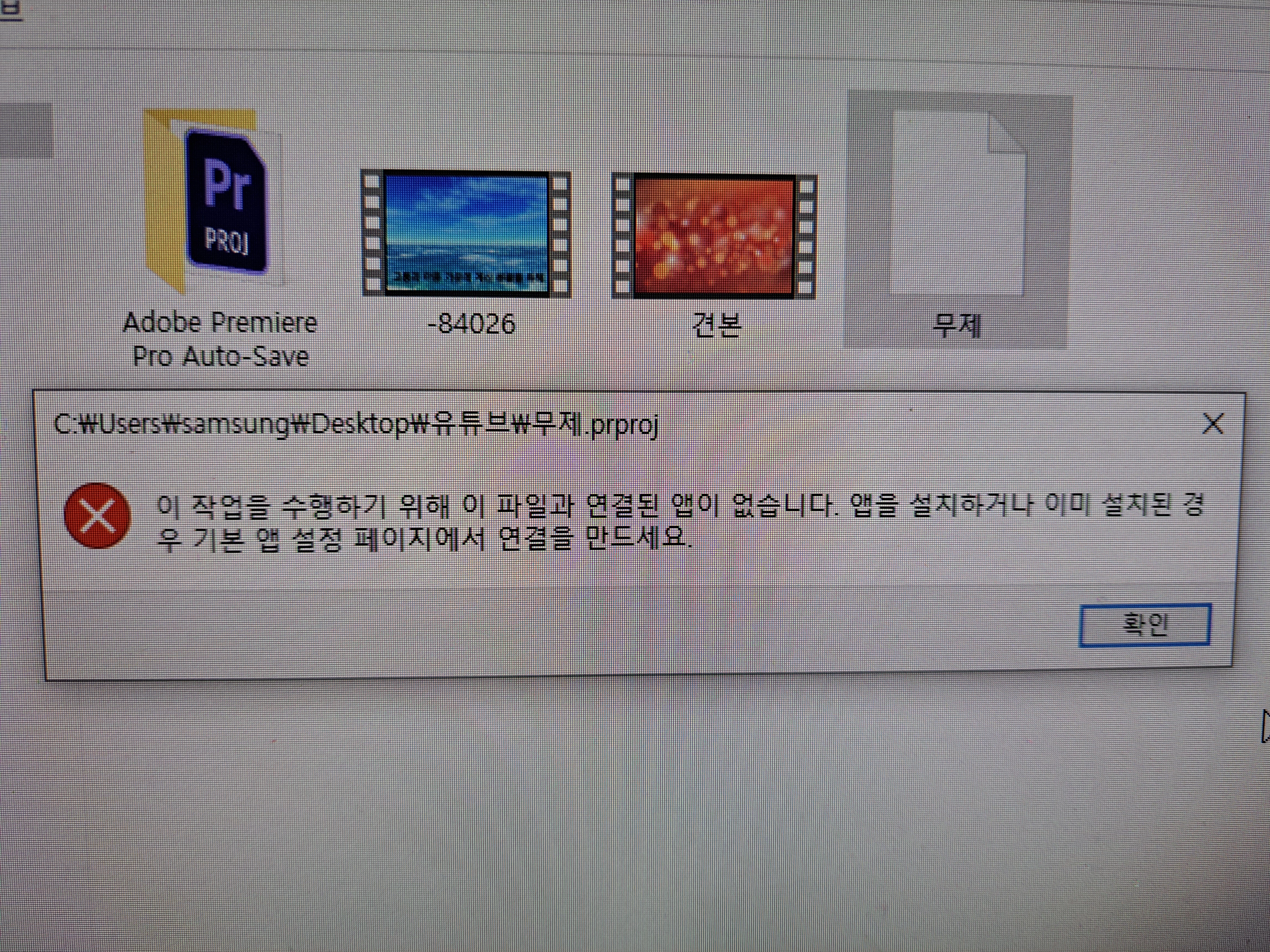 프리미어프로로 작업한 후 바탕화면 폴더에 저장하고 바탕화면 폴더를 열어 확인했는데 다음과 같은 메시지가 뜨네요
