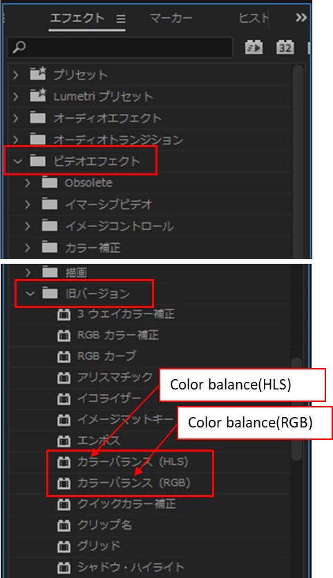 기존에 사용하던 color balance (RGB), color balance (HLS) 등 프리미어 기본 효과들이 없어져서 안보입니다.