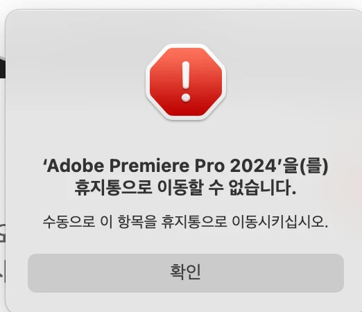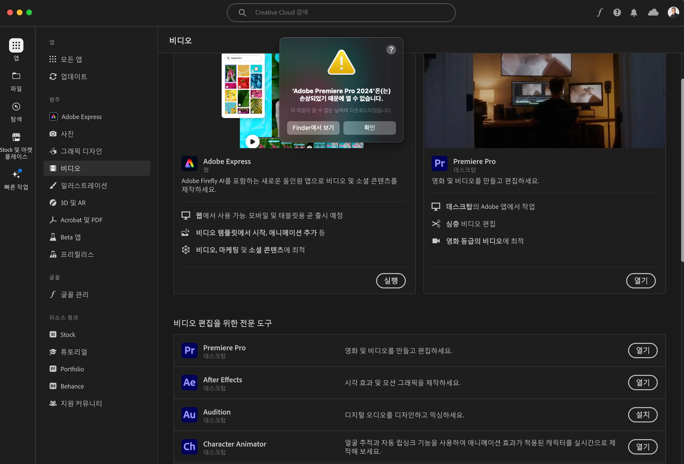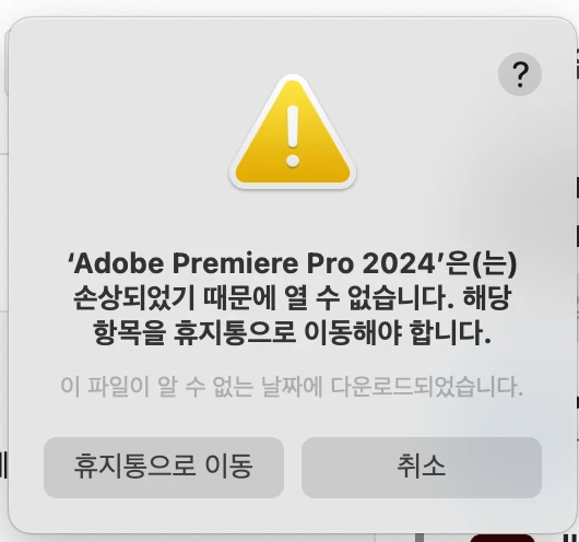 올올레풍경2ParticipantForum|Forum|2 years agoNovember 23, 2023Question프리미어프로 2024버전 실행오류Forum|Forum|2 years agoNovember 23, 20231 reply846 views칩 Apple M1 Max메모리 32GBmacOS Sonoma 14.1.1 Mac Studio에서 Premiere Pro 2024버전을 설치했는데 'Adobe Premiere Pro 2024(은)'는 손상되었기 때문에 열 수 없습니다.라는 메시지가 뜨면서 실행이 되질 않네요.프리퍼런스도 지워보고다시 지웠다가 설치해 봤는데도 똑같은 증상입니다. 혹시 해결방법이 없을까요?