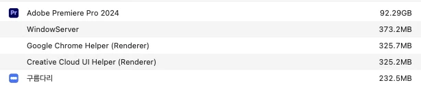 프리미어 편집할 때 중첨시퀀스로 멀티 카메라 묶고 편집하면 메모리 사용량이 저렇게 나오네요
