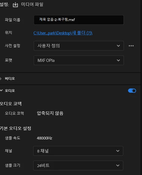 내보내기 시 포멧을 mxf op1a로 지정해주시고